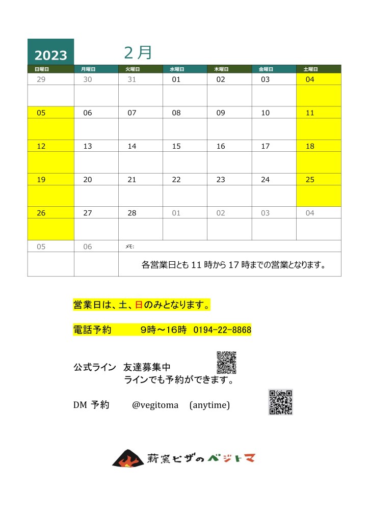 2月の営業カレンダーです。
