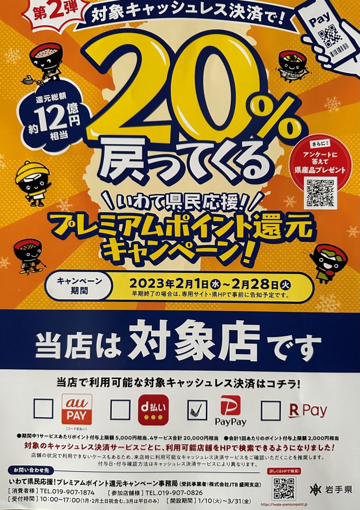 ペイペイで支払っていただけますと20%還元です。